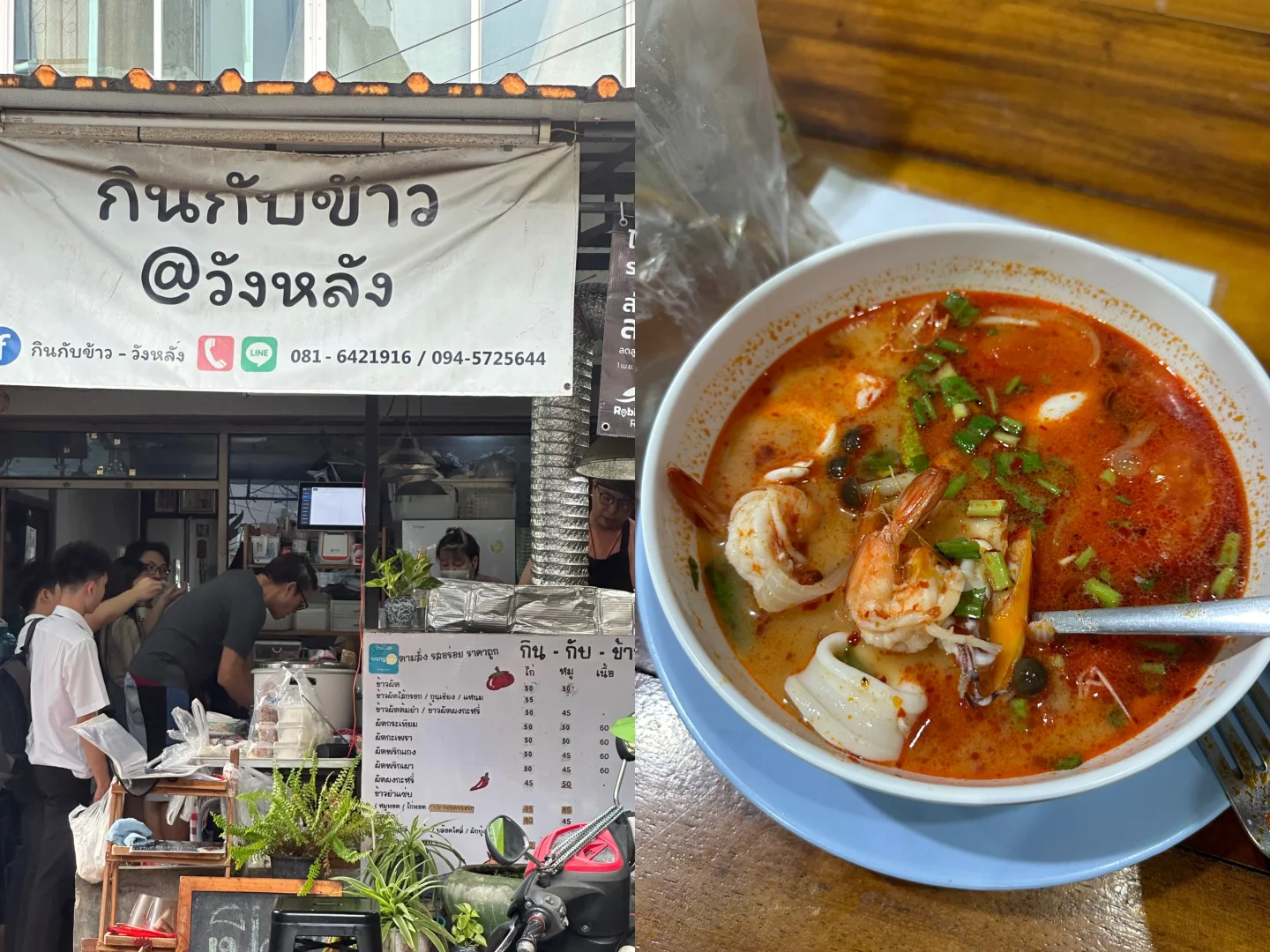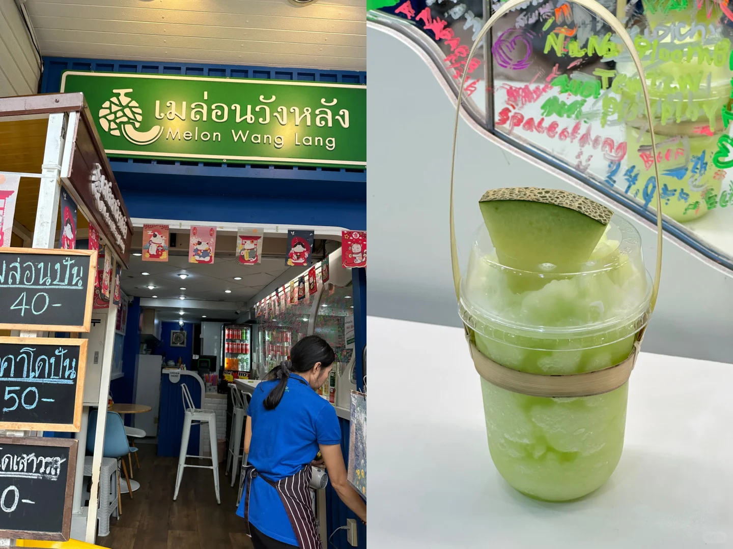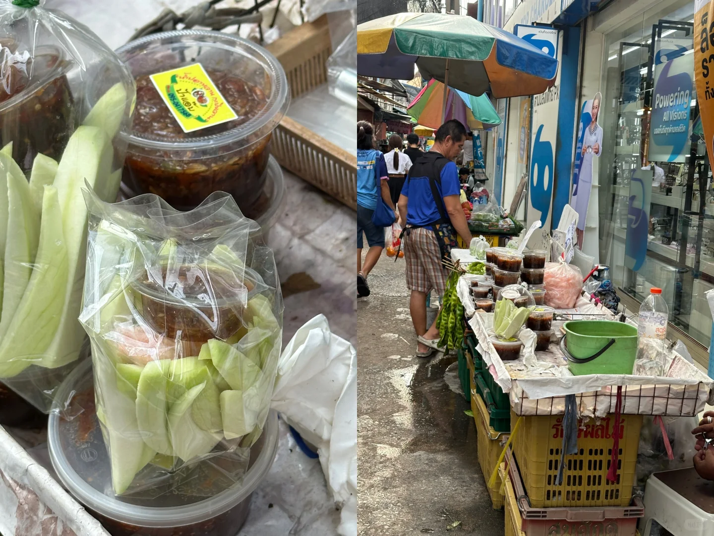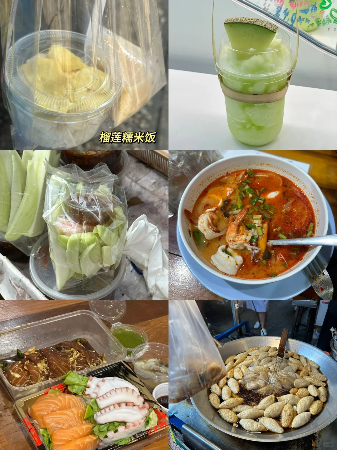 一整条路很好吃很好逛😋 我分享一下我喜欢吃的(中国胃) 🫶 photo3:我不允许没人没尝过榴莲糯米饭, 抱着猎奇的心态,才60🐷,尝一口一发入魂。 糯米和榴莲的香甜交积一起,我没放那个奶,怕太甜了,就是路边两个小姐姐的摊位买的。 🫶 photo4:哈密瓜🍈沙冰,又好看又好喝 我看推荐牛油果沙冰,我没点 40🐷 🫶 photo5:天生一对泰剧里的酸芒果,搭配酸甜枣(不知道是不是加了虾的味道)还挺奇妙 20🐷 🫶 photo6:强烈推荐!做打抛饭的,我是逛到转角小巷里看到,附近的医院人员和学生都来吃,我因为小吃吃多了点了冬阴功汤,本来等了二十分钟有点不耐烦了,上来一整个巨好喝,人多不是没道理的,120🐷,放了很多材料,鱿鱼🦑和虾都很新鲜。整一个酸酸辣辣巨好喝。 🫶 photo7:来了两次王朗都会吃的日料店,鱿鱼和三文鱼搭配,鱿鱼脆脆的,三文鱼也不错,一盒150🐷 🫶 photo8:路边买这个炸鱼丸,外皮有点韧劲,但是越吃越好吃,搭配酸甜酱 40🐷 按照我口味分享给大家。