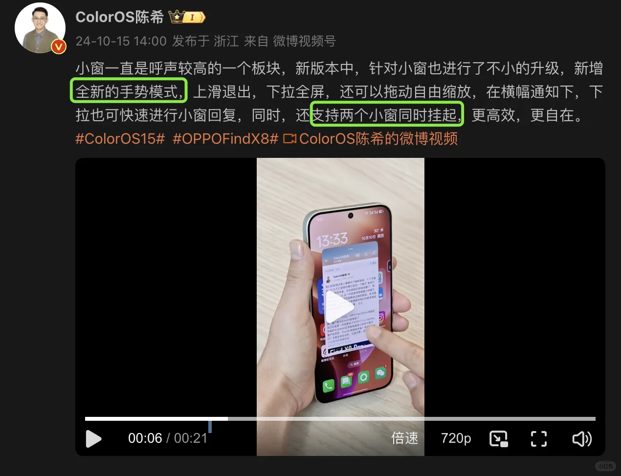 ColorOS 15还有一圈即问⭕️、语音摘要、AI去反光、📷拍照问答、德芙般丝滑的流畅度、全新小窗等等,特别是这个小窗,操作更便捷、流畅还支持同时挂两个,而iOS一直没小窗...不知道ColorOS 15、OPPO Find X8还有啥惊喜,蹲下10月17日系统发布会、24日手机发布会~😋