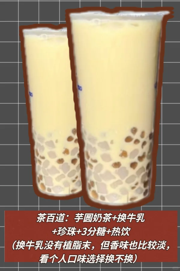 2️⃣茶百道:芋圆奶茶+换牛乳 +珍珠+3分糖+热饮(换牛乳没有植脂未,但香味也会比较淡看个人口味选择换不换)