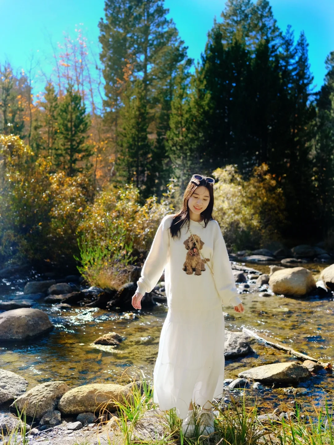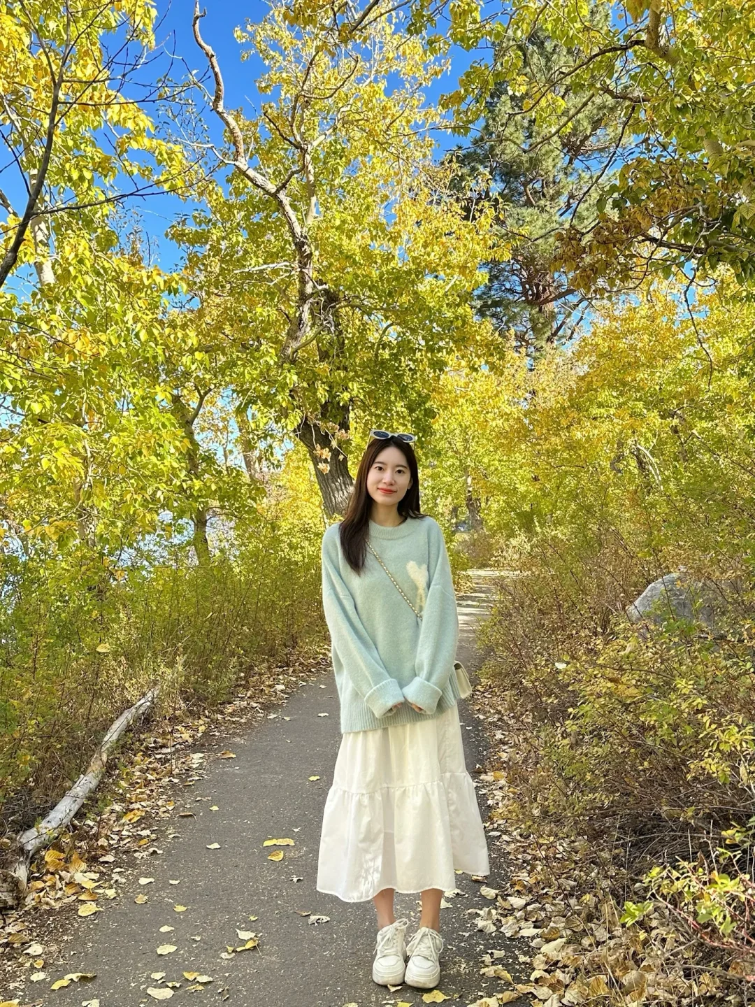天气☁️🌞:中午下午时候会很热,可以穿短袖的程度。早晨和晚上都很冷,要穿厚外套/毛衣。很喜欢ami 的浅蓝色爱心毛衣!被路上小姐姐夸夸啦好开心。Hollister 的小狗毛衣也很可爱!这俩毛衣跟白裙子都很适配,适合秋游。