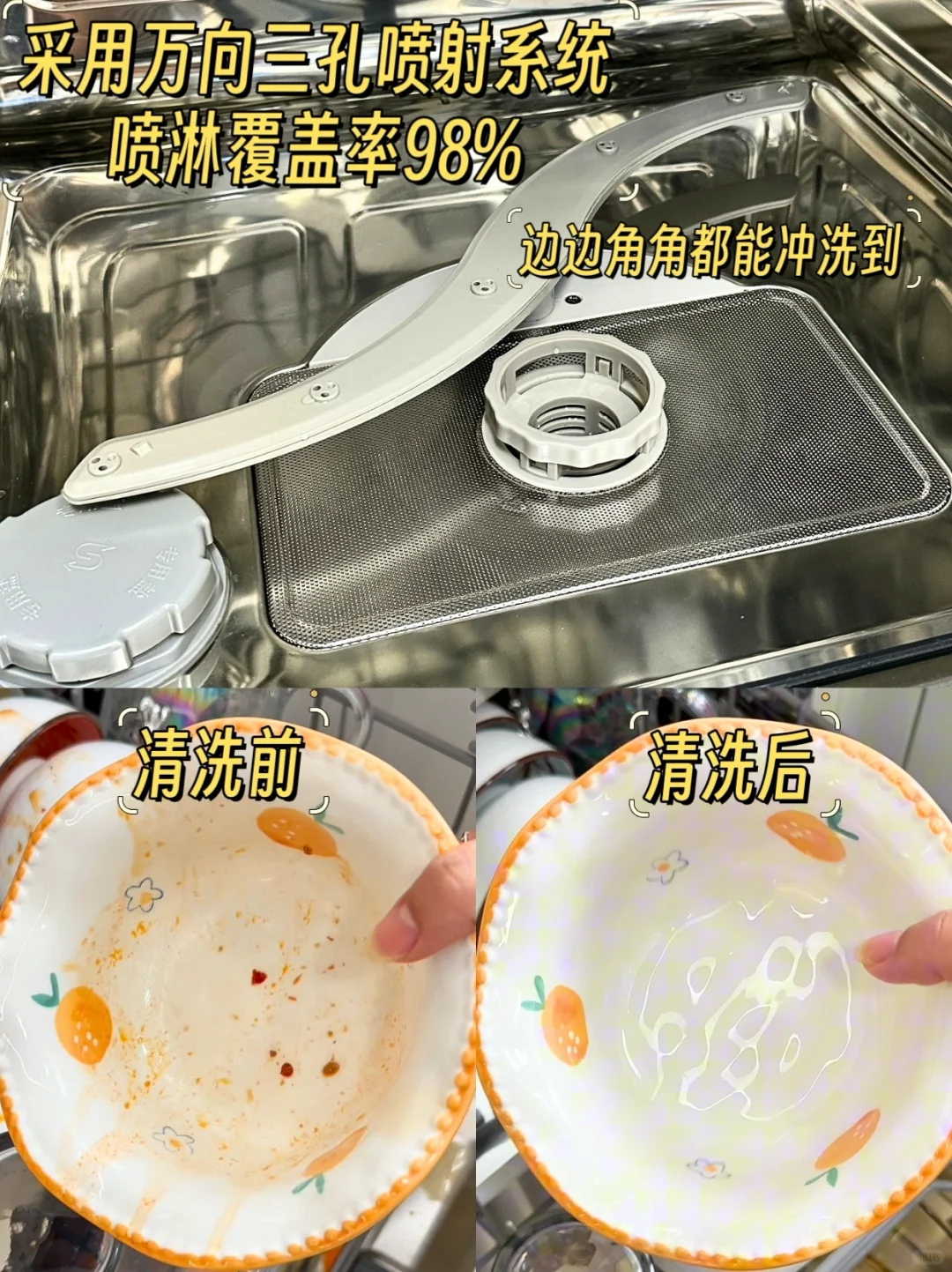 🧐它的喷淋臂上有好几个三口喷头,据说能够万向喷射,喷淋覆盖率98%,几乎可以做到无s角冲洗。还有3.2万pa高压水柱喷洗+68℃高温热水溶解油污,我仔细看了午饭吃剩下的油腻腻的餐具,确实洗得非常干净👍~跟新的没什么区别。