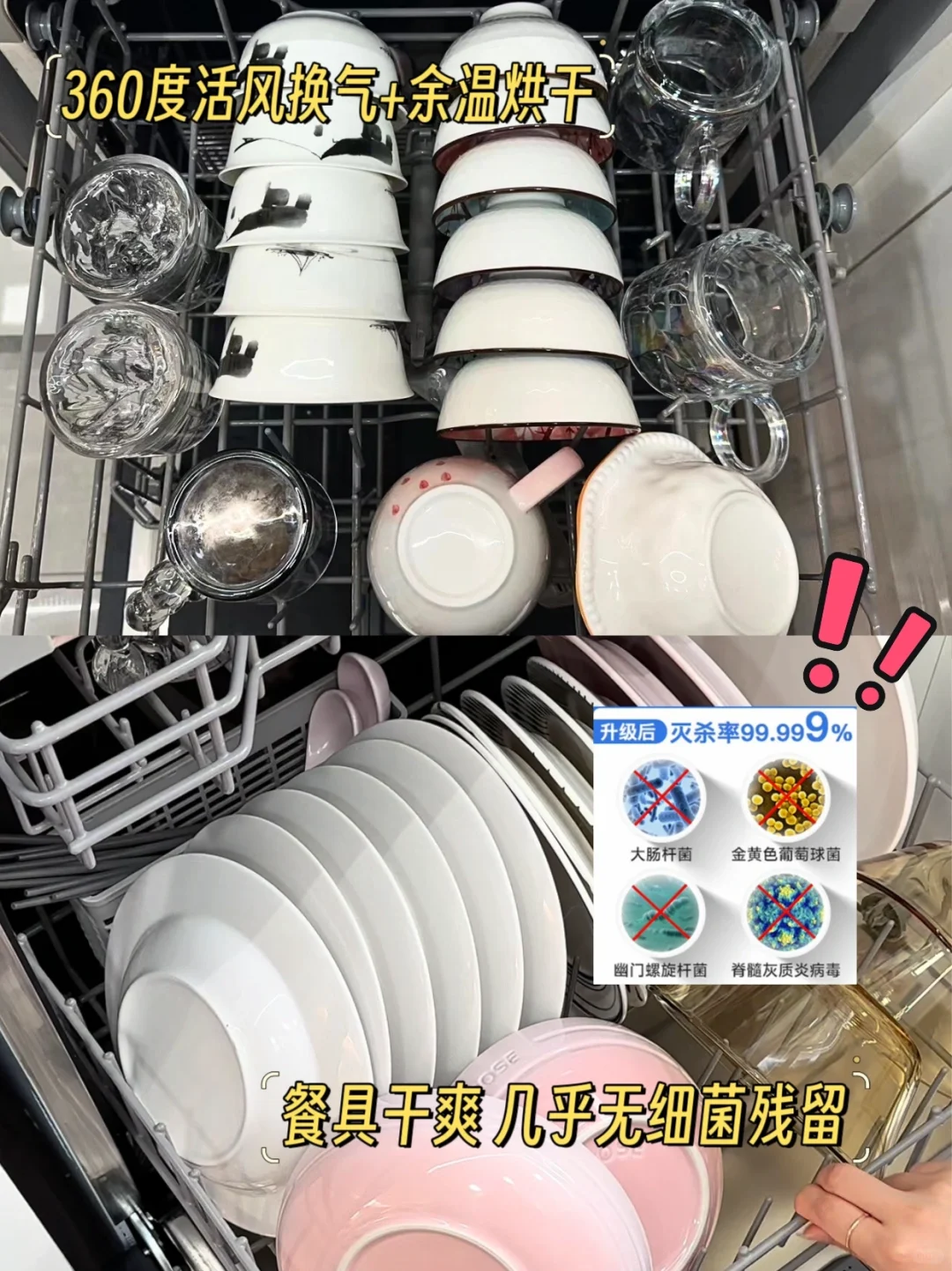 🧐洗完之后,所有餐具还都是干干爽爽的,我妹说这是因为洗碗机可以360度活风换气余温烘干,s菌率有99.999%✅,所以拿出来的餐具既干爽又卫生。