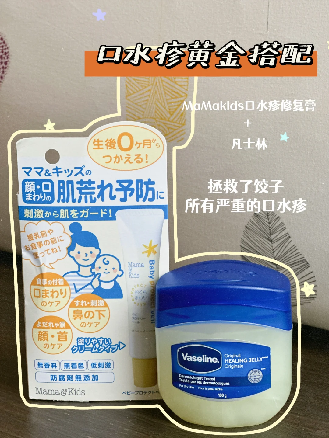 饺子口水流的非常频繁!只要擦不及时就会有口水疹。Mamakids口水疹药膏超好用[点赞R]温和无香无味,舒缓修复效果很好。只要宝宝睡觉擦上,睡一觉起来就会好。但是如果白天还是继续流口水🤤,又会反复。mamakids只能起到修复,不能隔离口水和皮肤接触。所以白天用凡士林隔离口水+睡觉的时候用mamakids口水疹修复=[烟花R]黄金搭配!
