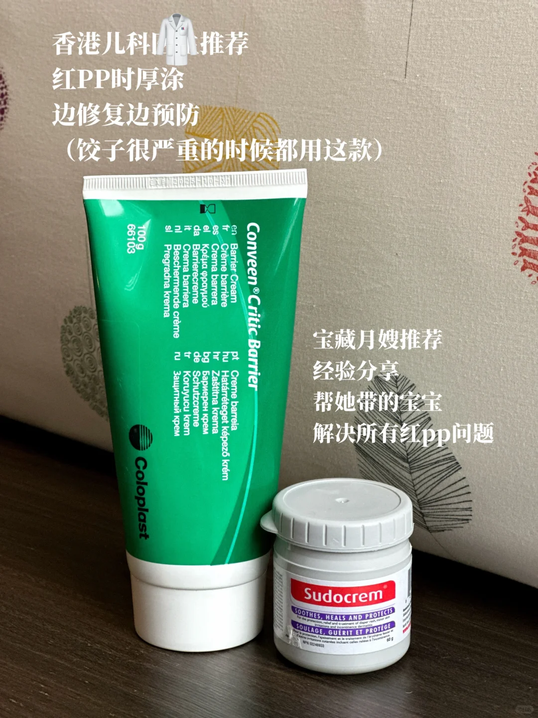 饺子四个月做过一次肠道手术,术后康复一天拉20次💩💩。屁股红的程度可想而知。 [爆炸R][爆炸R]处理红PP,我可以说相当有经验!!!👑 烫伤膏、蒙脱石散等方法都试过,对于我们用处不大。最后香港🥼推荐的Coloplast绿色pp膏厚涂+保持干爽+疯狂晾屁股痊愈了。香港新生儿ICU严重红PP也用同款。饺子的pp非常敏感,到现在依然很容易红屁股。 严重的话会用这个即修复又预防恶化的pp霜。轻度红屁股就用sudocrem薄涂+晾屁股。 解决红屁股的关键是让pp保持清洁和干爽,所以只要多晾就一定会好。没有捷径!