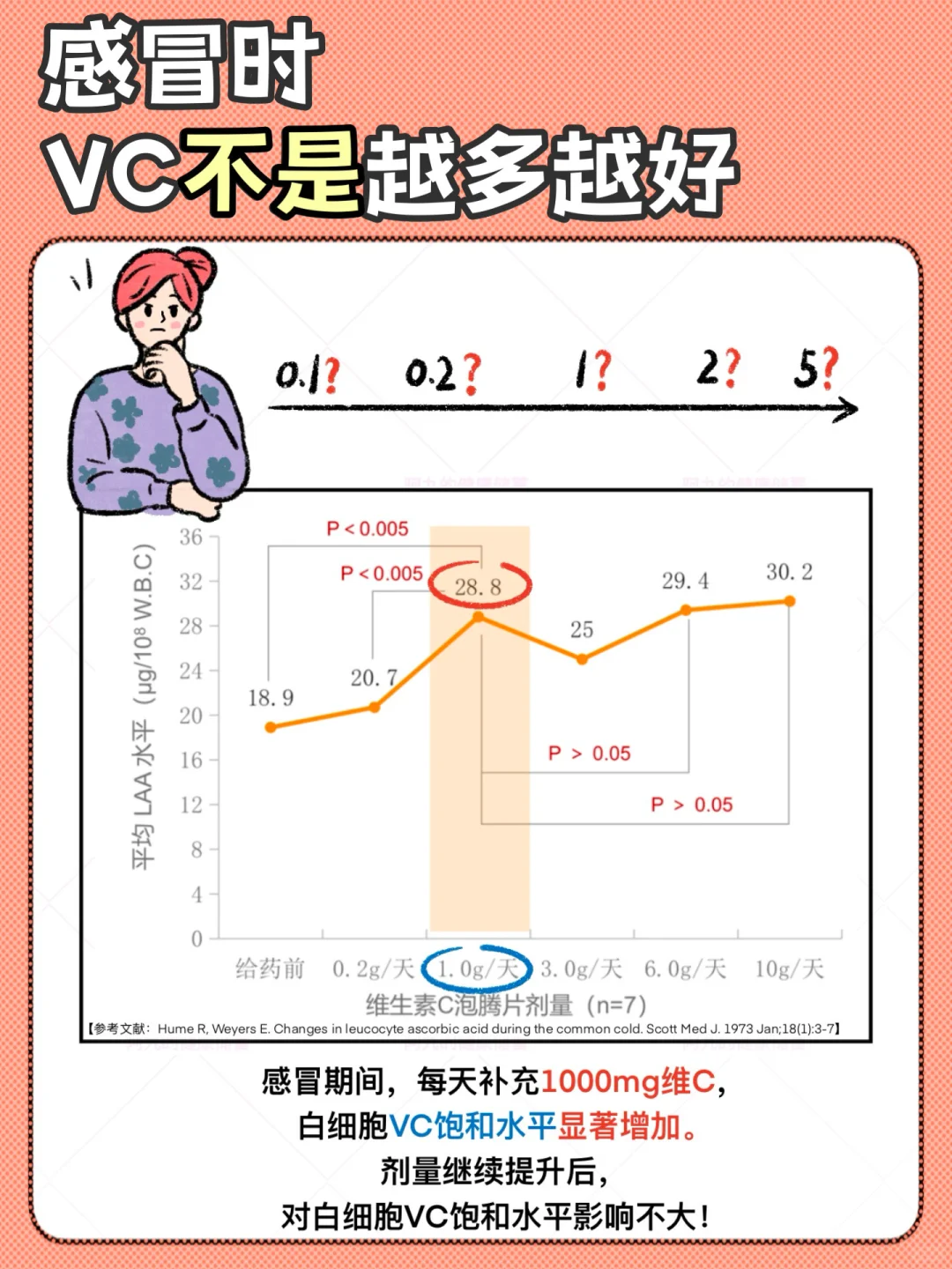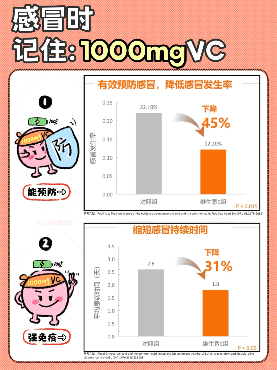 2023年12月最新荟萃分析显示1000mg维生素C可缩短严重感冒病程。