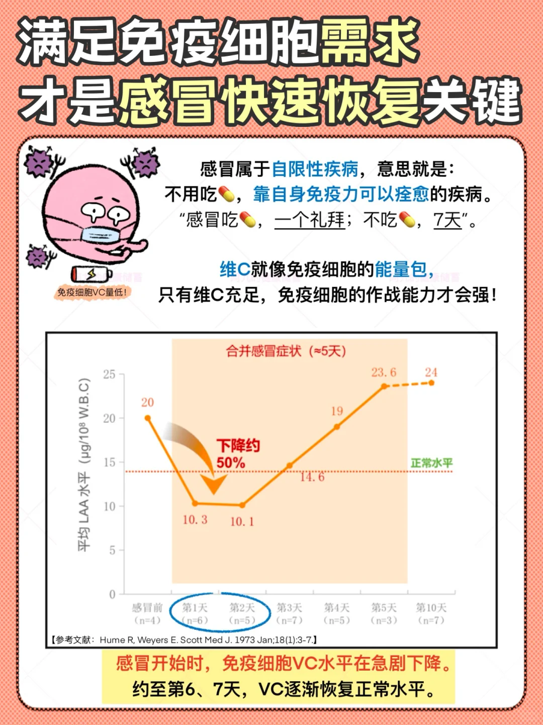 有研究显示:在感冒初期,免疫细胞的维C水平急剧下降,然后在第6-7天逐渐恢复到正常水平。