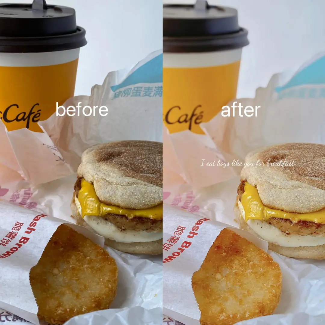 好久没有吃过m记的早餐了 主要是馋薯饼了 为什么薯饼不能24h供应!![暗中观察R] 💛拍摄:iPhone 💛滤镜: 🍊iPhone:原相机 鲜明度+50 高光-30(降低亮处) 阴影-5(降低暗处) 对比度-10 饱和度+15 色温+8(提高食欲感) 锐化+40(提高清晰度) 🍊安卓:🌟图 滤镜—质感—中性叠加原生 光感+30 高光-25(降低亮处) 阴影-10(降低暗处) 对比度-10 饱和度+15 色温+10(提高食欲感) 锐化+50(提高清晰度) 参数不是固定的 根据实际情况调整 大家注意数据高一点的参数即可 💛质量修复: app(wink) 针对锐化过后建议用一次质量修复 质量修复后图片会比较清晰柔和 ~~~~~~~~ ❤️主页会持续更新构图和滤镜❗️