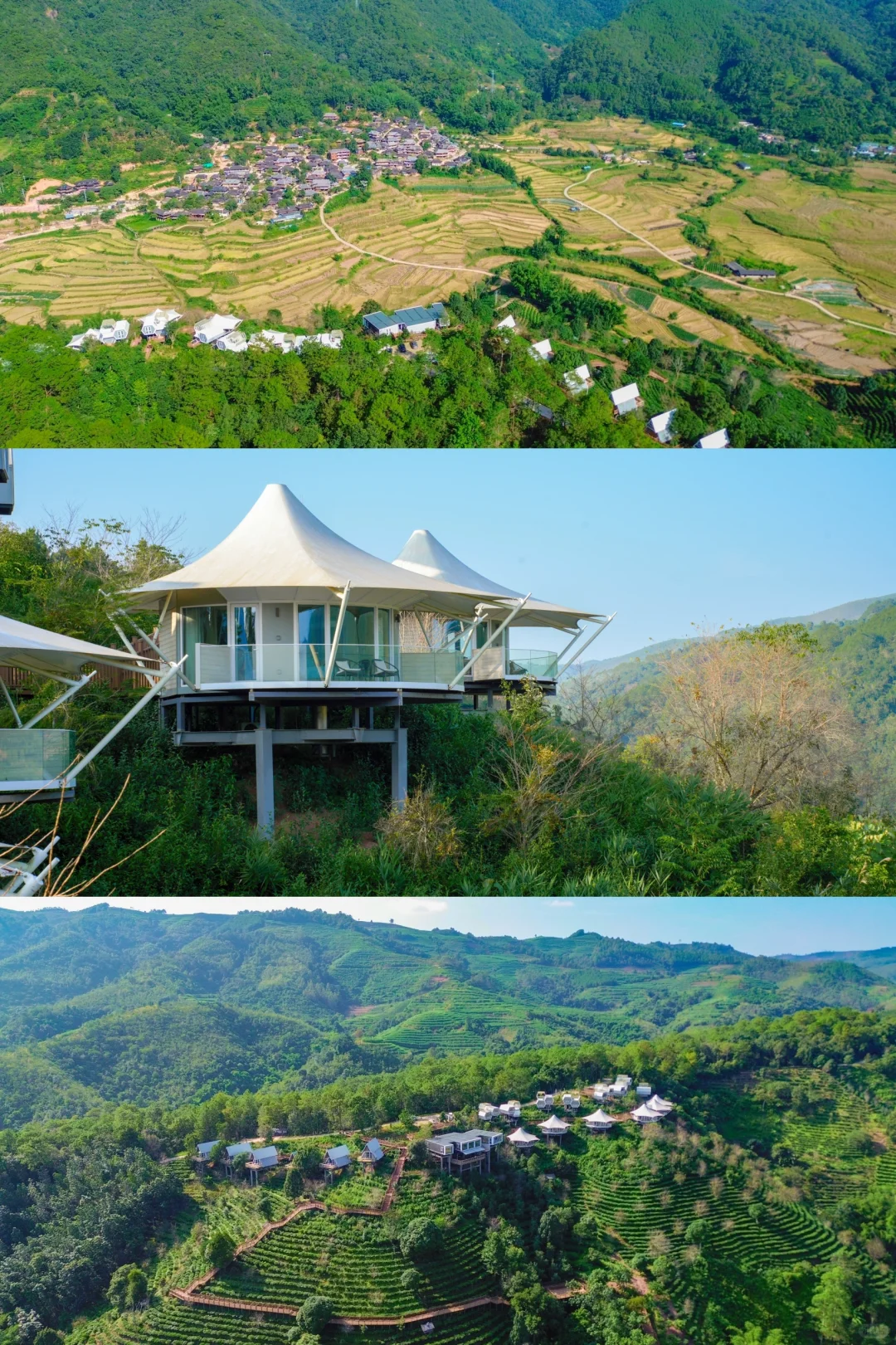 推荐山顶的携程农庄,农庄围绕着“林、茶、田、寨”的主题进行打造,仿佛是从山林间自然生长出来的一般。20 套高品质民宿错落有致地分布在山顶之上,架空的设计让它们与蓝天白云、山林茶园相互交融,可以俯瞰整个老达保美景。