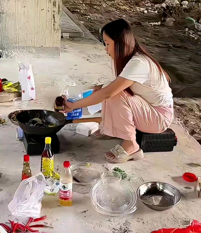 桥底下发现漂亮的两个流浪女孩在炒菜。看着她炒菜出来的香气,搞的我口水都流出来了。