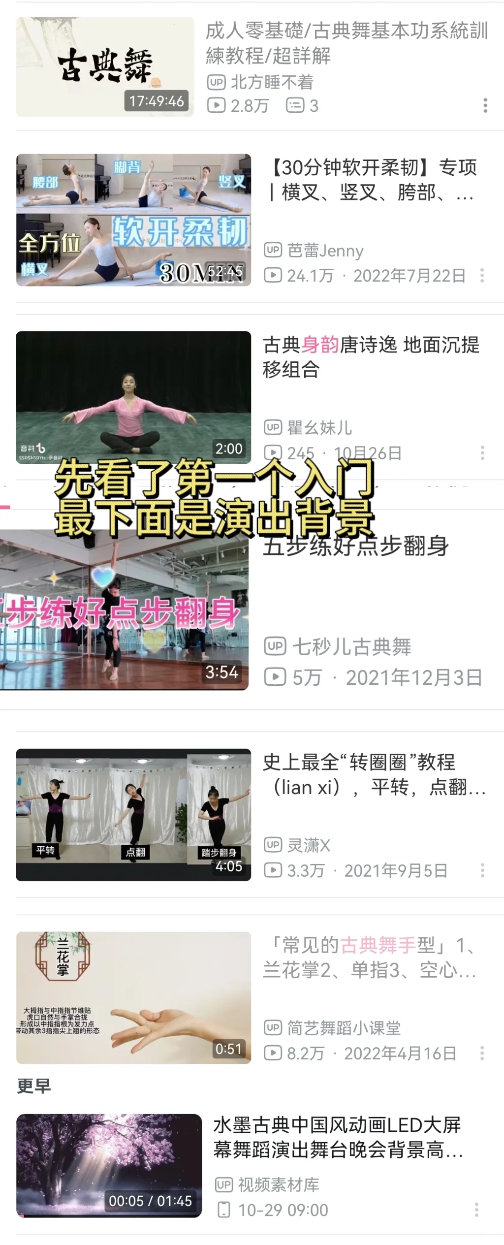 关于基本功:软开和身韵基本会每天练一练,大概一个月,最后可以一字马。平时没事就做一些手指的练习,还有压手腕。