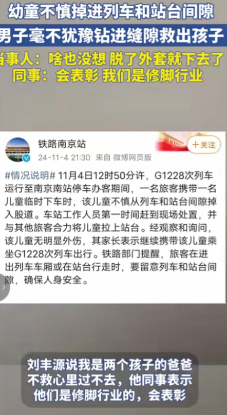 11月4日晚,南京站再次上演了一出惊心动魄的救援行动。一名儿童在候车时,不慎失足掉入列车与站台之间的狭窄缝隙,现场气氛瞬间紧张到了极点。