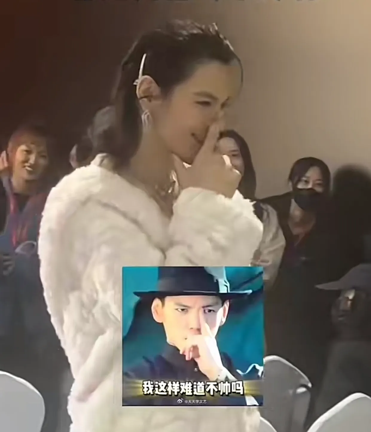 露背毛绒睡衣加中长卷发,头饰耳饰项链一样不少,再加上标志性的手指摸鼻动作,吸引了多少人的目光。不知道的还以为他把郭碧婷的保暖睡衣穿出来了。