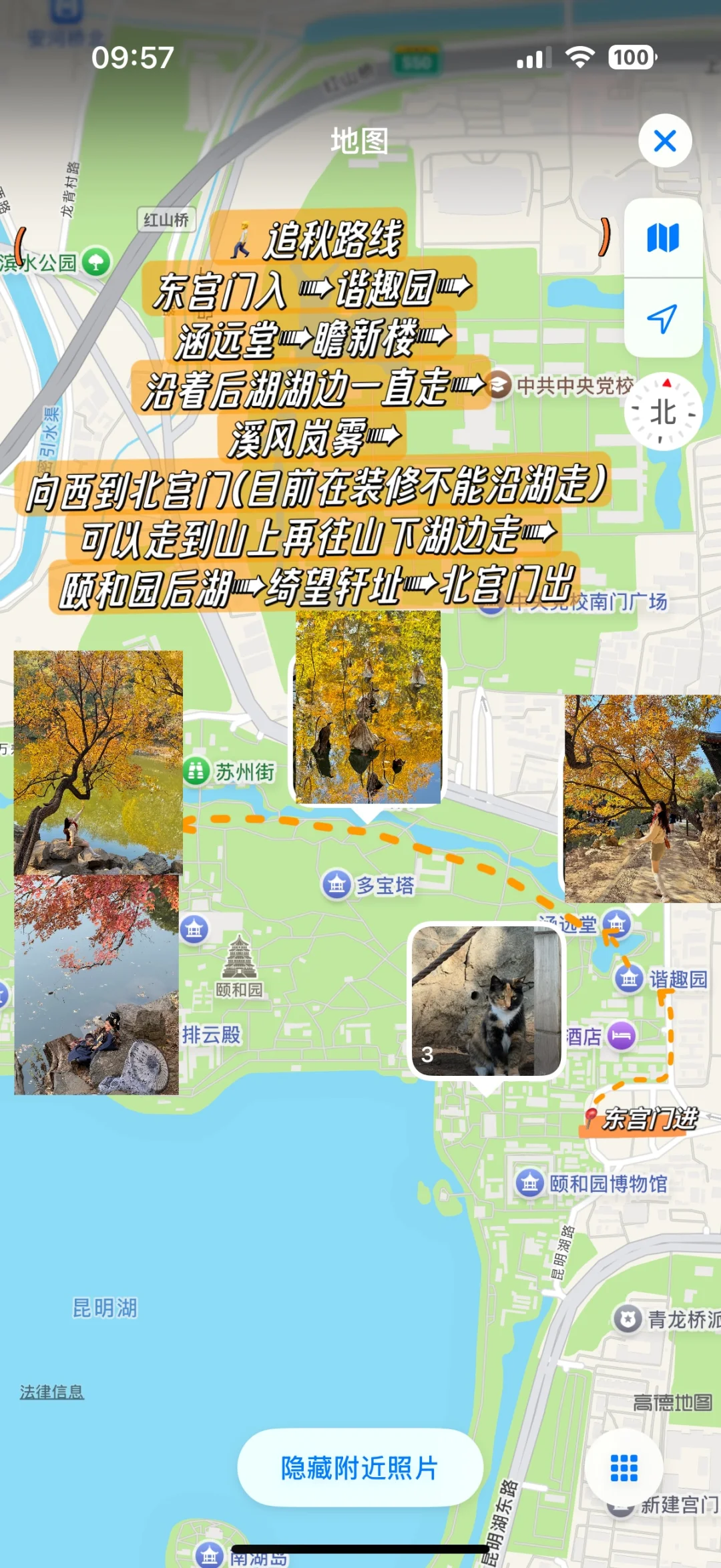 东宫门入 ➠谐趣园➠涵远堂➠瞻新楼➠沿着后湖湖边一直走➠溪风岚雾➠向西到北宫门(目前在装修不能沿湖走)可以走到山上再往山下湖边走➠颐和园后湖➠绮望轩址➠北宫门出