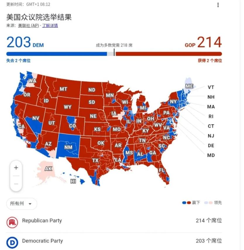 从大选日结束至今已有6天了,参议院已开始选举多数党领袖,懂王也开始进行内阁成员的任命,但唯有众议院连票都没开完,效率奇低无比! 根据媒体的报道,象党已拿到217个众议院席位,距离多数党地位只差一席。但在AP上仍旧显示只拿到214席,而选举数据一般都是以AP宣布的为准。 而根据菠菜平台Polymarket预测,象党最多可以拿到221席,成为多数党的概率也超过80%。 虽然知道最终可能的结果,但迟迟不开,总有些莫名的担忧!