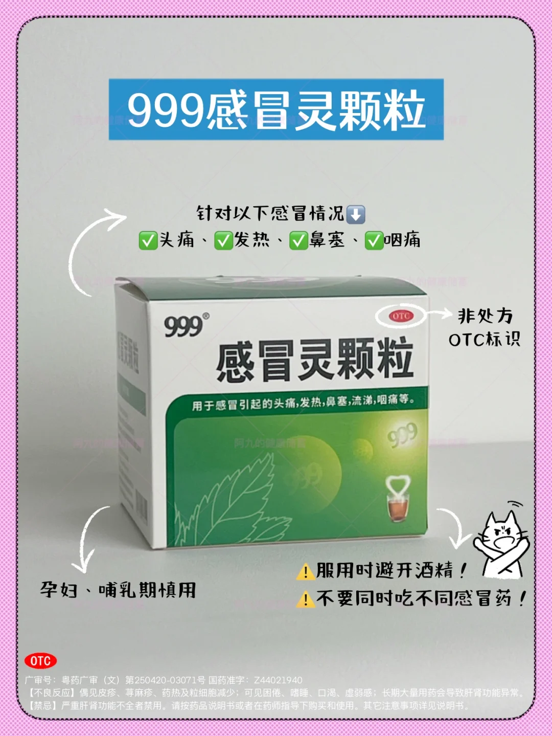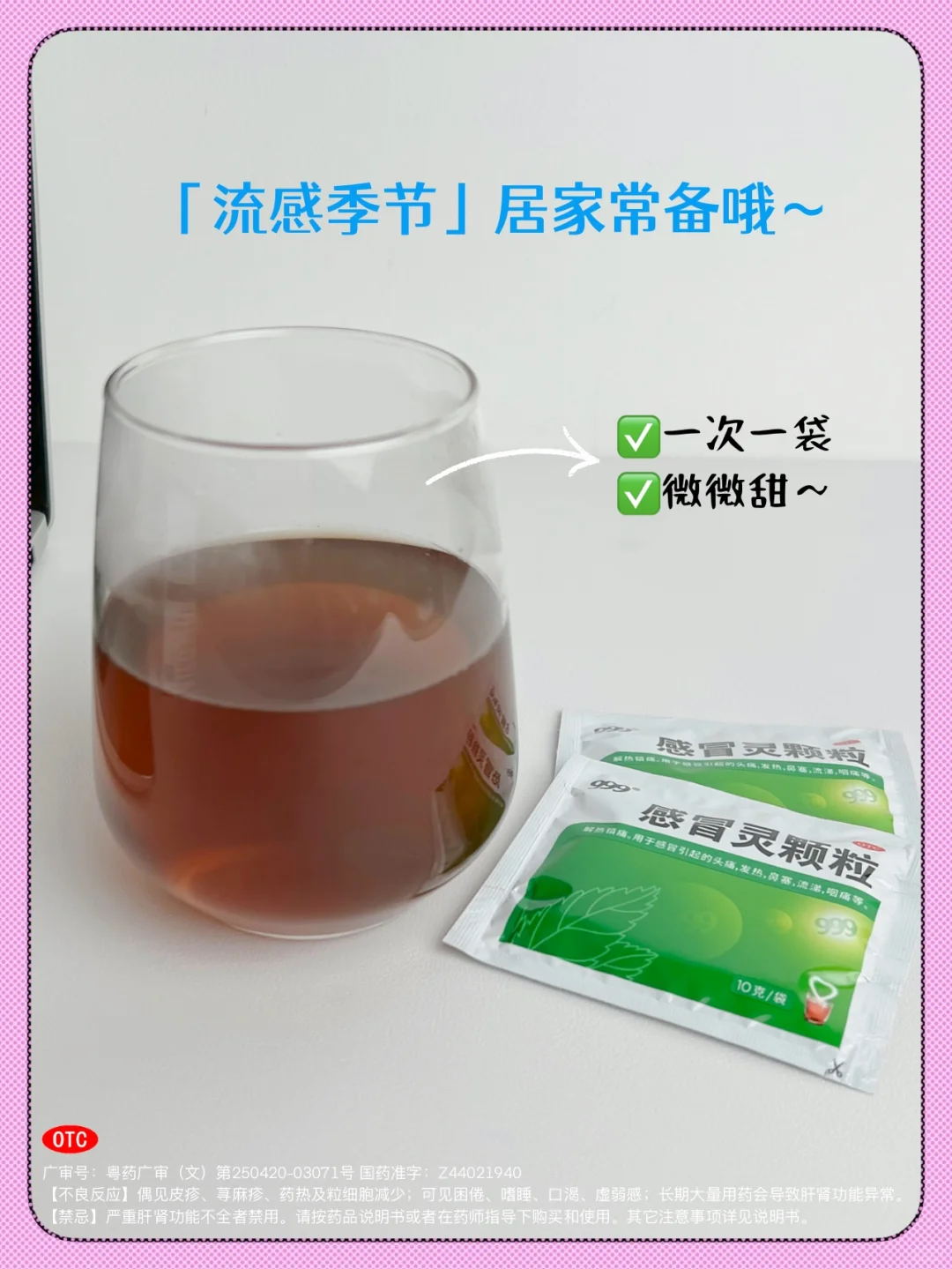 吃药时一定要对症!还有,有些人好几种感冒药一起吃,想快点好,其实这种做法真的是个大误区!如果药物成分一样的,剂量就过大了;如果不同成分的,成分之间可能还好相互干扰!999感冒灵颗粒是我家里面常年备着的,有备无患~它主要是针对感冒时头痛、发热、鼻塞、咽痛这几种情况。味道微微甜,很能接受。而且是冲剂式的,还能多喝点水。品牌大很放心,而且线上、线下,基本哪个药房都有。
