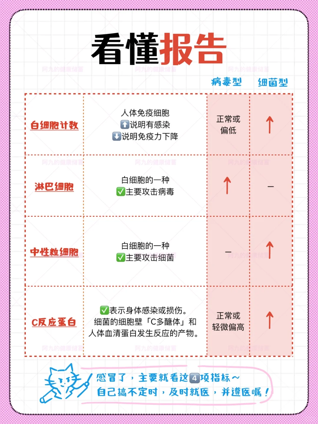 这里我再分享下我们去医院做检查时,涉及感冒相关的几个指标,什么意思以及怎么去看~(具体可参考图[四R])