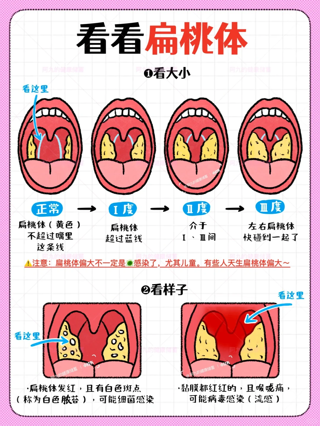 看扁桃体、看体温、看鼻涕(具体可参看图[一R]图[二R]图[三R])