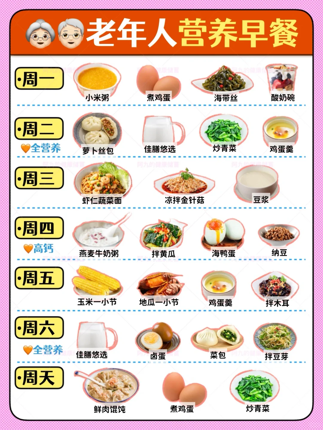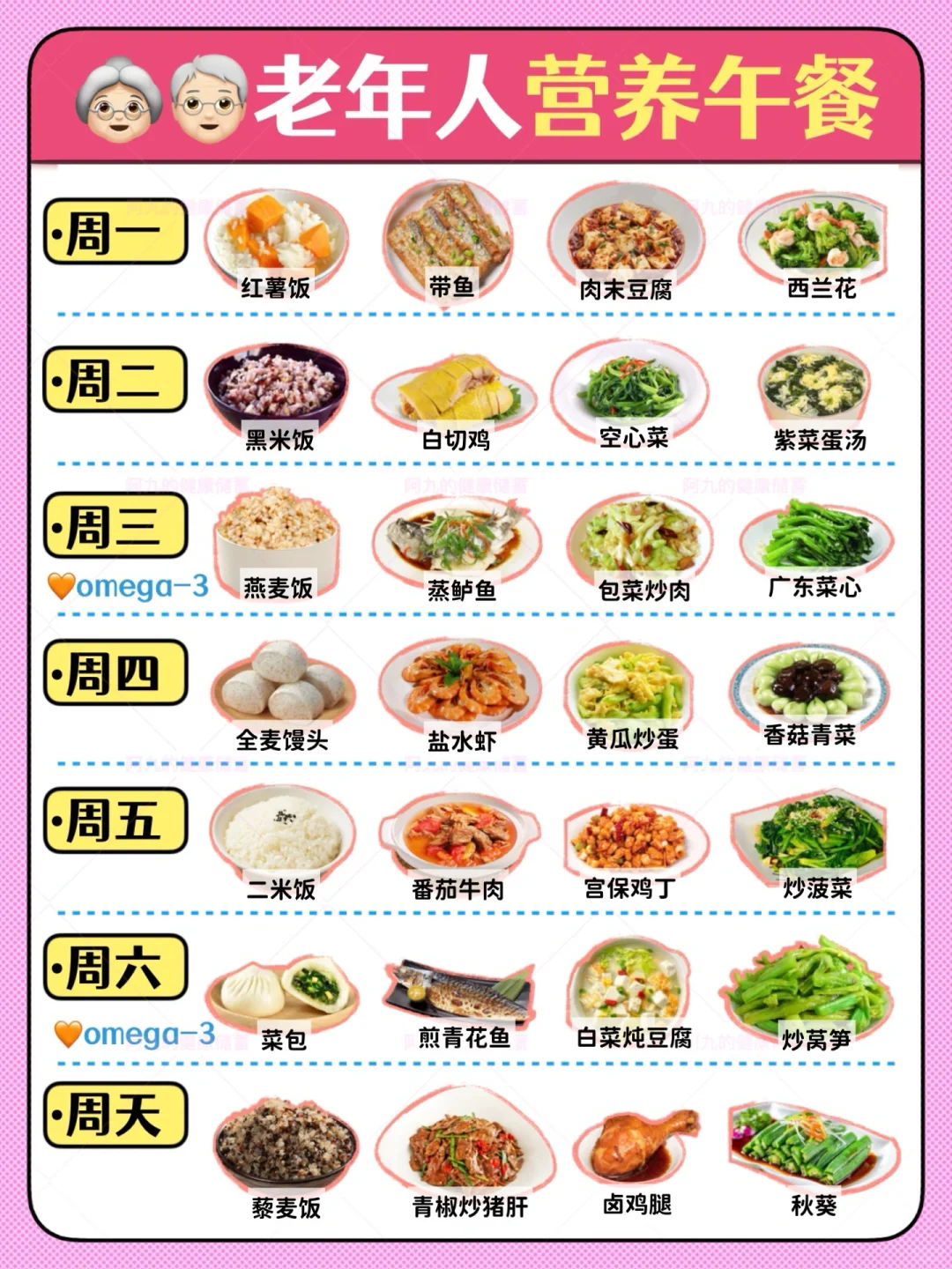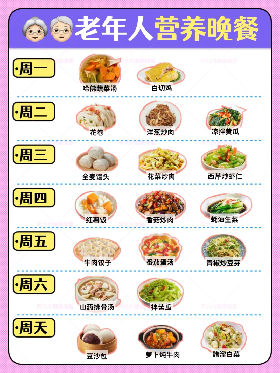 所以我就想整理了一周7天,早、中、晚食谱,手把手教他们吃的营养全面一些,非常适合老年人,不仅营养全面、均衡,而且利于老年人吸收~顺便分享给大家(图[一R]图[二R]图[三R])