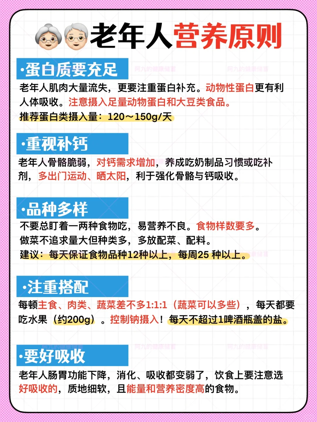 老年人营养原则可以参照《中国居民膳食指南2022》,简单的说就是蛋白质和钙要充足,而且要容易吸收利用的,优先选择优质蛋白;每天一定要换不同种类吃,每周食物种类超过25种是基本要求,这样才能补足人体所需的不同营养元素。(图[四R])