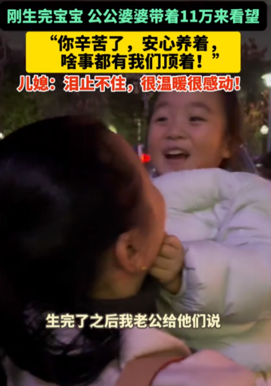 羡慕死了!河南,女子生二胎没和公婆说,生完之后才敢通知!万万没想到,公婆居然送来110000元现金红包!公公的一句话,让儿媳的眼泪止不住了!网友:往哪个方向磕头能有这样的公婆? 事情发生在河南许昌,可能有网友会好奇,为啥儿媳生二胎这么大的事都不第一时间通知公婆? 事实的真相可不是儿媳和公婆的关系不好,反而是关系太好,儿媳害怕二老太过担心。 因为早在第一胎生女儿的时候,公公和婆婆在产房外特别激动,他们心疼儿媳太遭罪,在外面守着一直着哭,所以这次生二胎就没敢第一时间通知。 直到11月21日,二宝成功生下来,儿子才告知了二老这个好消息。 这次公公和婆婆依旧很激动,不过心里面只剩下开心和喜悦,他们手里提的都是见面礼,还有高达11万的现金红包。 公公和儿媳说:“这是咱家给你的奖励!”其中1万元放在了宝宝枕头旁,还有10万元交给了头号大功臣儿媳妇。 而随后公公的一句话,让儿媳感动到眼泪都止不住了,一直扭过头怕别人看到。 公公说:“你辛苦了,放心养好身体,现在你啥都不用操心,一切有我跟你妈在后头给你们顶着!” 对此有网友表示羡慕了:真幸福,我儿子高一了,没看见公公婆婆一分钱,一双袜子。 还有网友分享同款公婆:我11年生孩子,我婆婆给了2万,买婴儿用品又花了2万,走的时候又给一万!孩子前6个月一月一万,六个月以后一个月给5000元,一直给到孩子3周岁! 也有网友表示:我没有遇到好公婆,但以后会当一个好婆婆,自己受过的委屈,怎能让自己家的人再受一遍? 网友的这句话真是把格局打开了,家和才能万事兴。 并不是说人与人之间的感情一定要用金钱来衡量,就像视频里的公公婆婆一样,那种给儿媳的重视是扑面而来的,隔着屏幕都能感觉的到。 这样温暖的家庭氛围,想不把日子过好都难! 你觉得呢? (信息来源:AHTV第一时间)