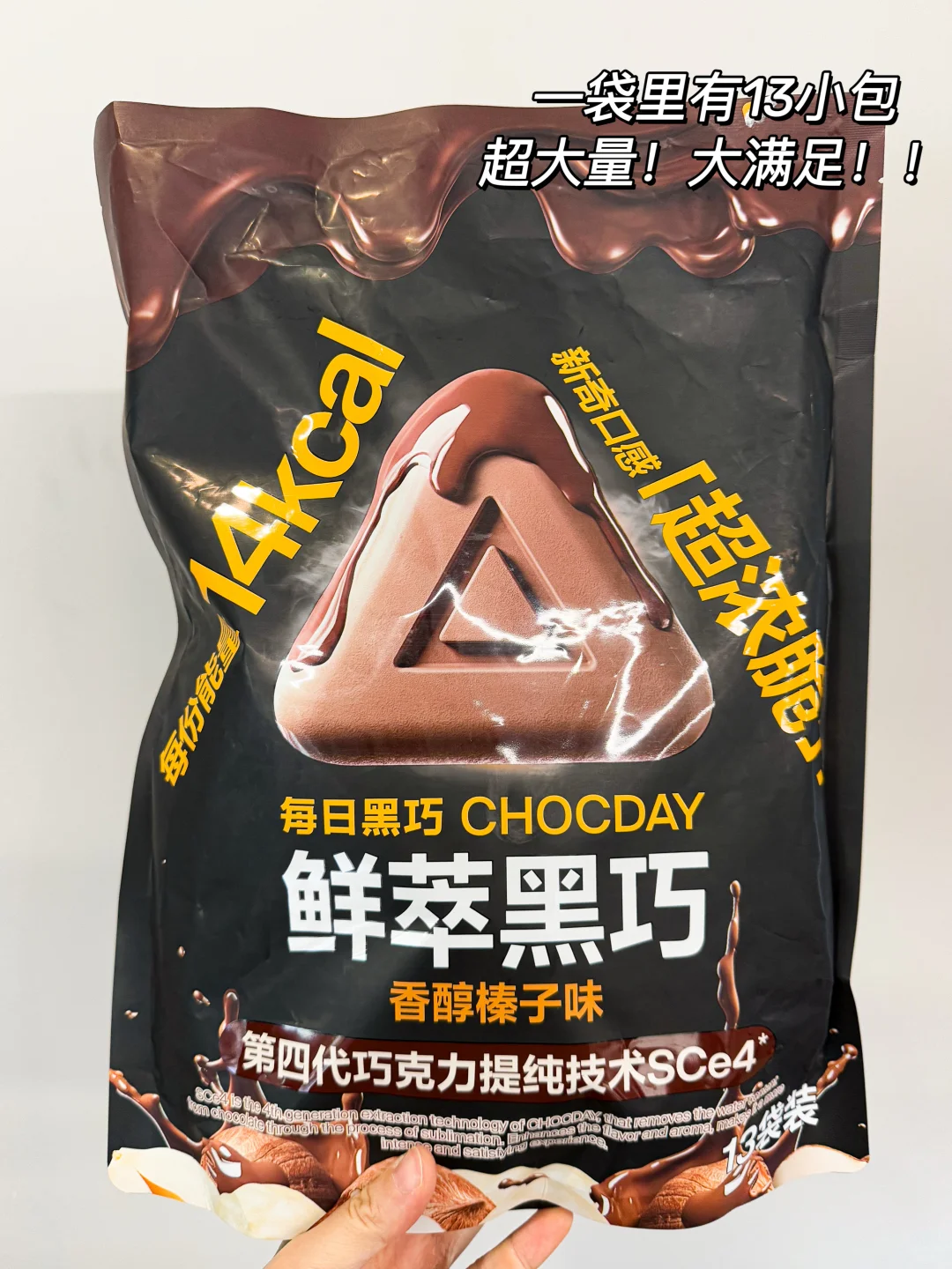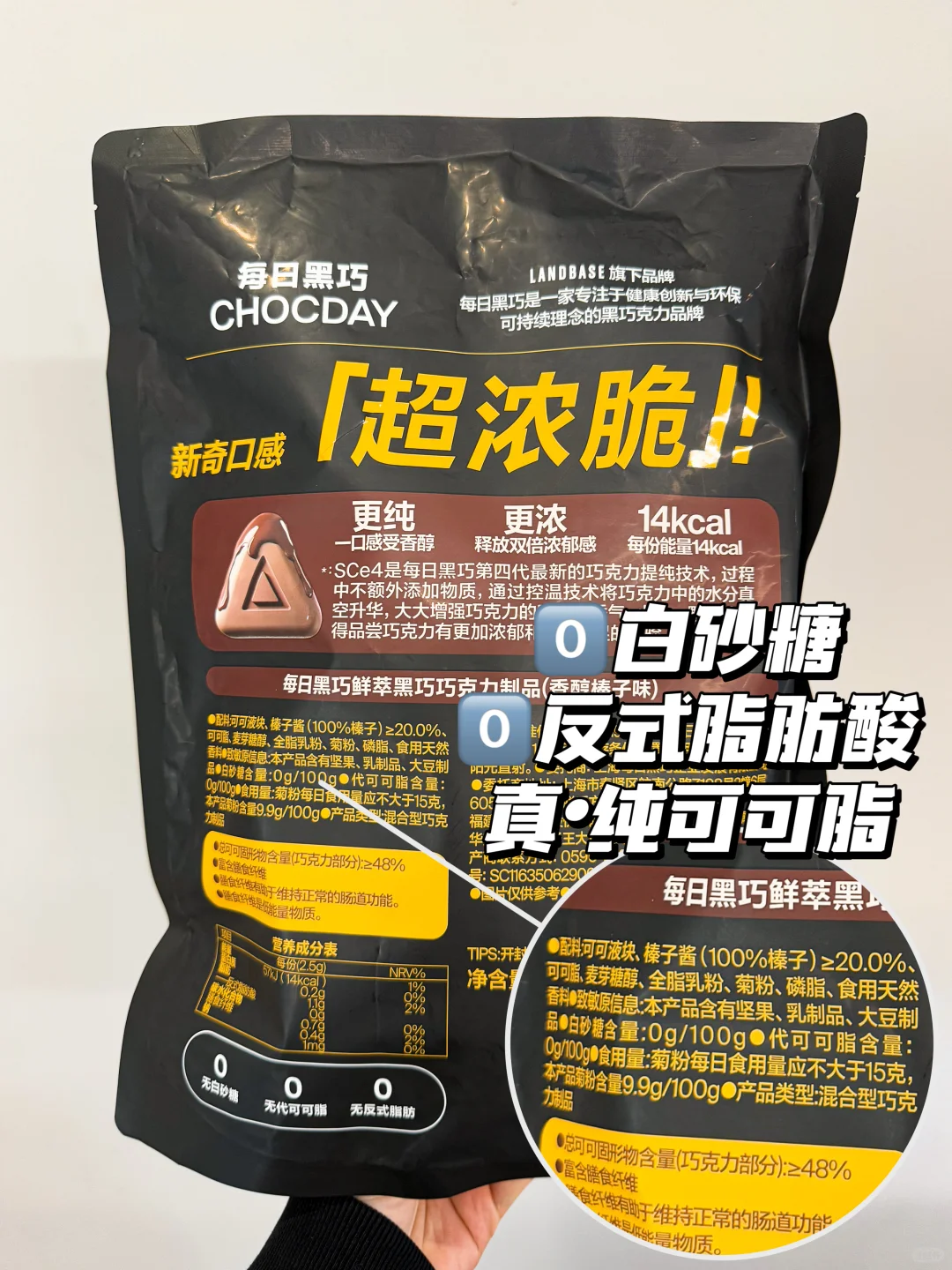 这个鲜萃黑巧种草了几天,终于有空去山姆买回来吃上了,结果和我朋友俩人一天就吃光了....🍫脆的巧克力吃起来就是爽,一口嘎嘣脆,我俩追剧嚼了一下午,越吃越想吃 味道是那种微微苦,但也不是很甜的那种,🥰榛子和黑巧结合就是无敌,吃起来特别香! 买之前就看了眼配料表,0️⃣白砂糖、0️⃣反式脂肪酸、纯可可脂的,吃起来很放心,而且热量很低...1颗才14大卡,吃多了也没有负罪感🤩我和我朋友各自又买了1包,准备放工位,嘴馋的时候就吃几颗~