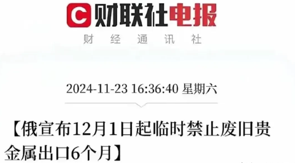 俄罗斯又出怪招,俄罗斯政府于2024年11月23日宣布,将从2024年12月1日起至2025年5月31日,临时禁止废旧贵金属的出口。这可不得了,俄罗斯作为重要的贵金属供应国,其在,在全球铂金供应中占比高达40%,俄罗斯是美国第三大铀供应国。俄罗斯的这一举措震动全球,将对全球贵金属市场产生重大影响。