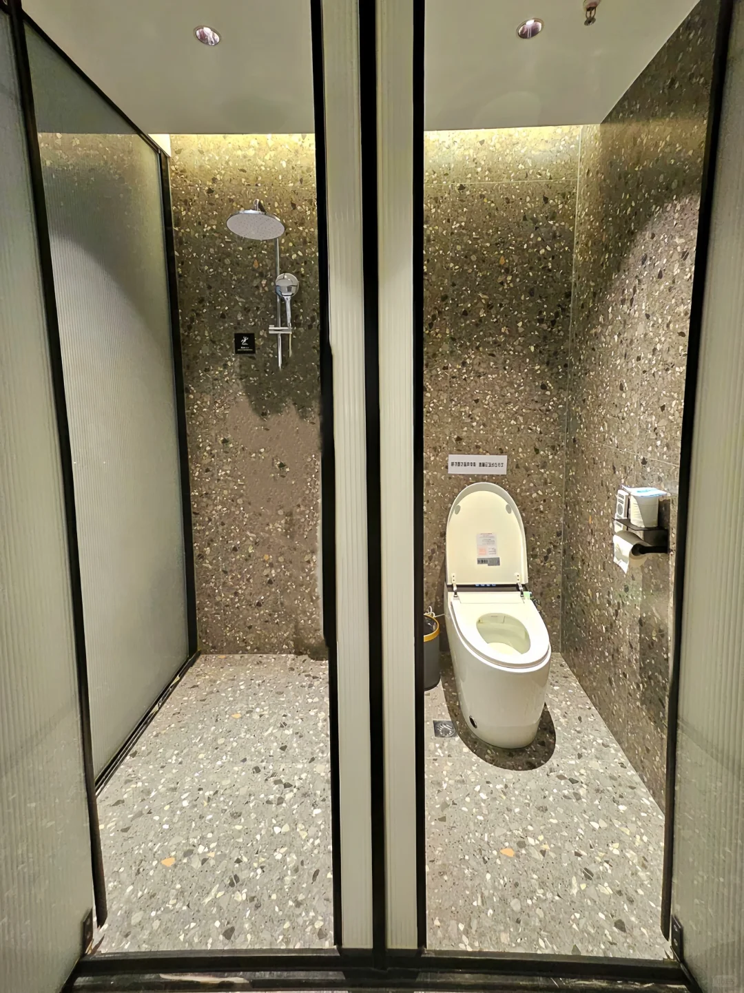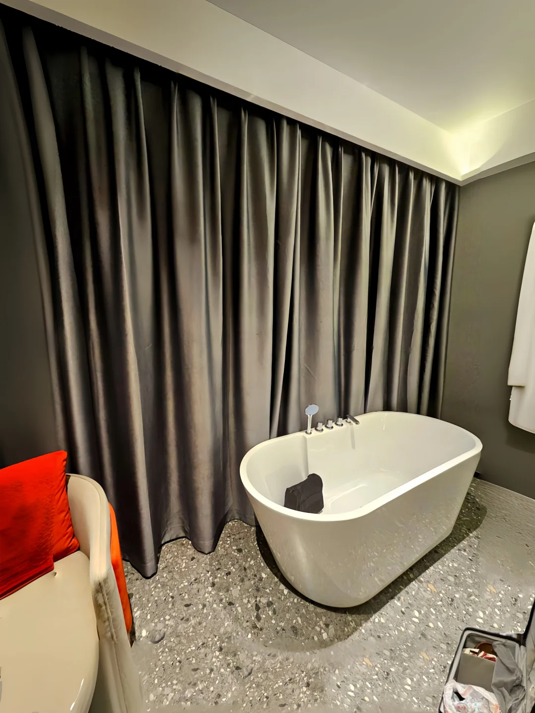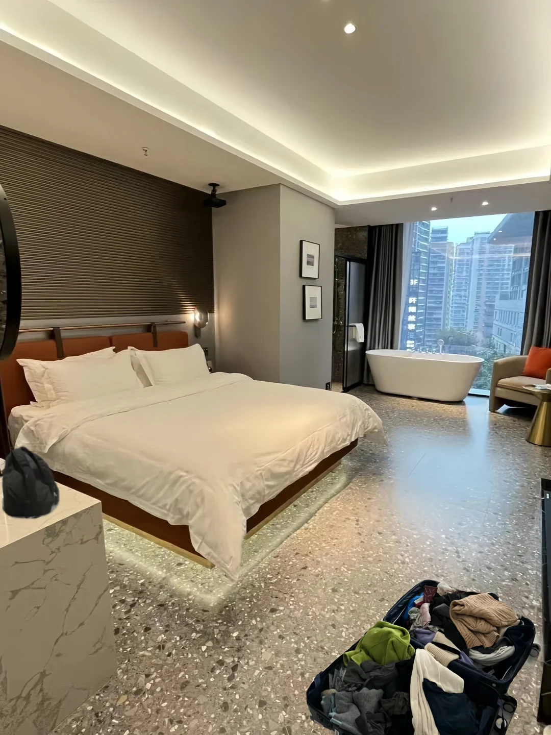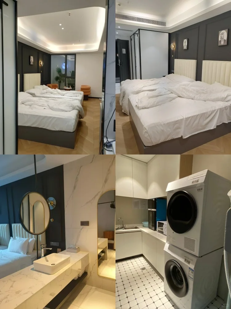 空间很大,大落地窗可以俯瞰城市夜景~设施非常人性化,配备了高清投影、小冰箱、洗衣机、烘干机以及智能马桶,浴缸可以泡澡,泡泡浴液、一次性马桶垫、一次性浴缸垫毛巾都有