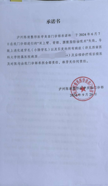 今年6月,李女士再次来到陈清美容,这一次,她决定做抽脂手术,希望能塑造出更加苗条和有型的身材,6月6日,在与医生详细沟通后,李女士决定进行全身抽脂,涉及腰腹、胳膊和后背等多个部位,手术费用大约一万五千元,她满怀期待地签署了手术同意书,期盼着早日拥有魔鬼身材。