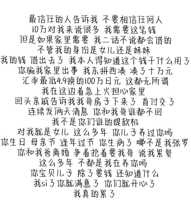 据了解,这位女子多年来一直在日本打工,积攒了一笔不小的积蓄,原本打算用于回国后开个小商店或者作为应急资金。然而,她怎么都没想到,这笔钱居然被母亲以急需用钱为由骗走了。当她得知真相后,多次尝试联系母亲和哥哥讨要说法,但均无果。绝望之下,她选择将此事发布到网络上,希望得到网友的支持和帮助。