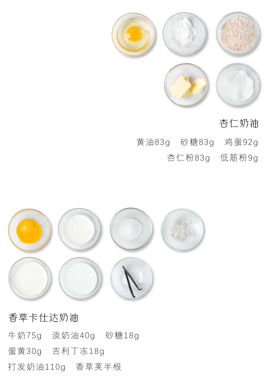 1、将香草卡仕达奶油裱挤到杏仁奶油上至与挞壳齐平,抹平后冷冻15-20分钟。
