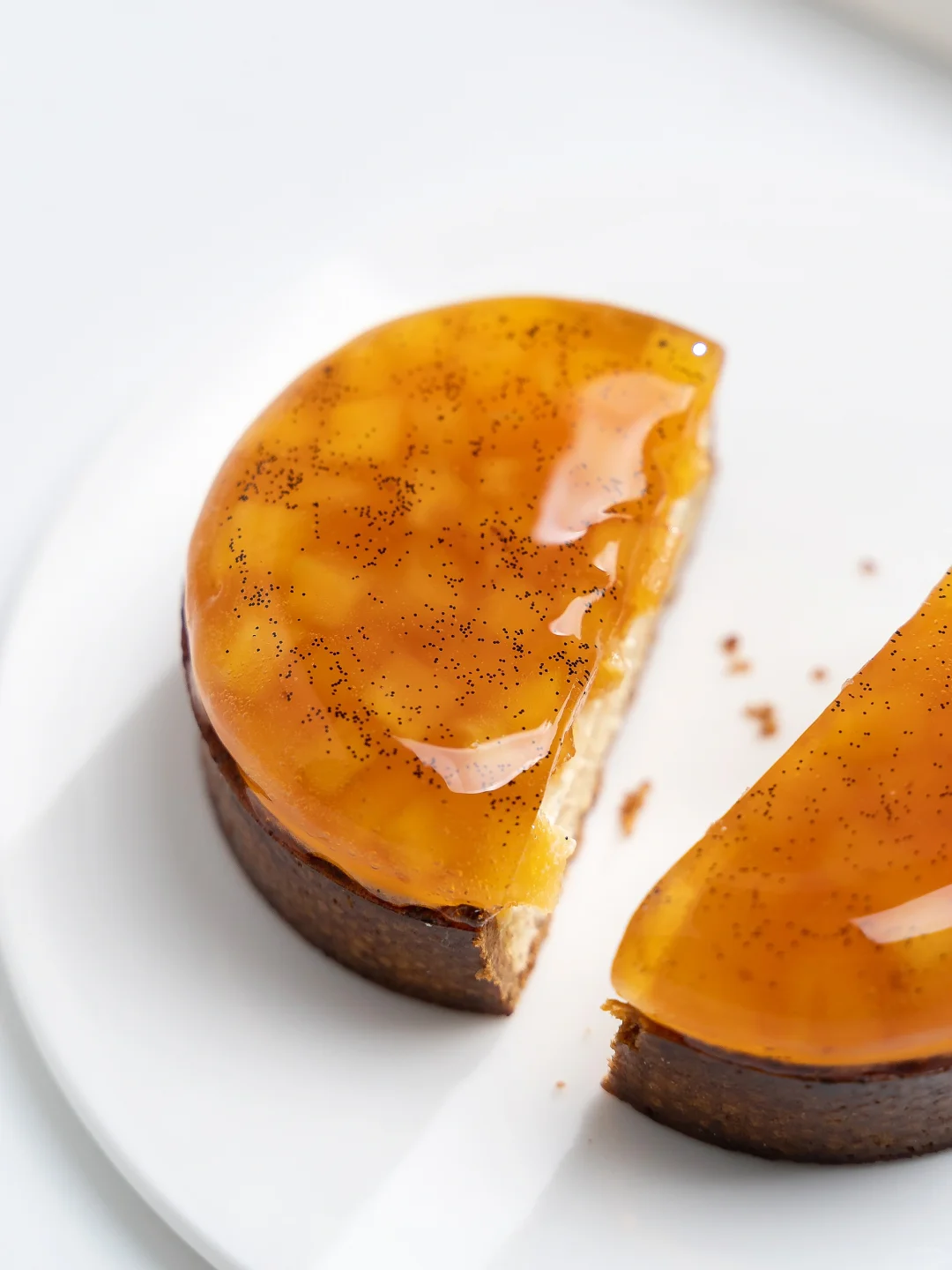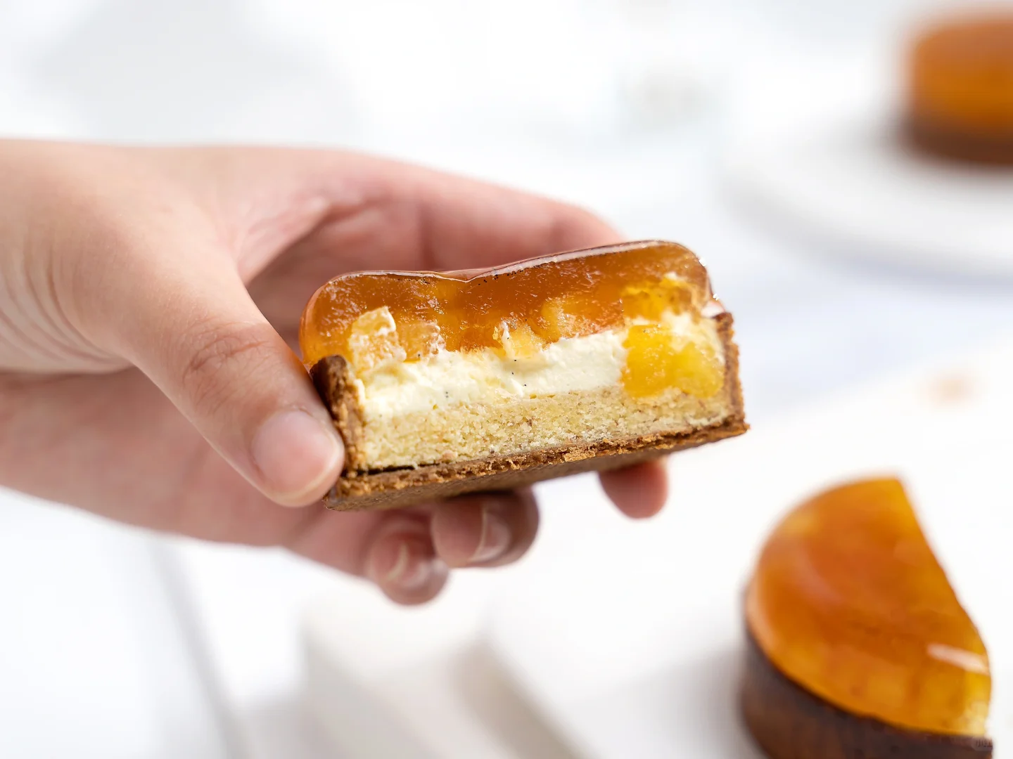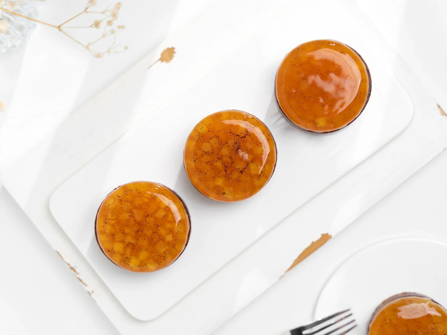 2、啫喱冻硬后脱模,表面淋上透明淋面(30°C),流平后组装到挞壳上即可。
