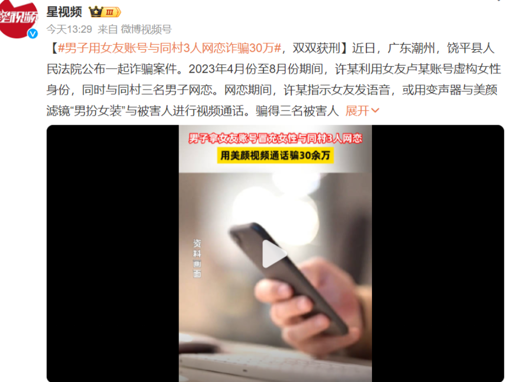 (参考信源:星视频2024-11-28——【男子用女友账号与同村3人网恋诈骗30万,双双获刑】)