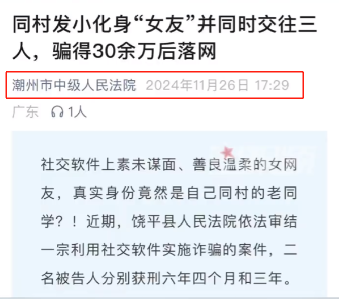 近日,广东潮州饶平县人民法院公布了一起令人咋舌的网恋诈骗案件。三名痴情男子被同村小伙许某用女友卢某的账号精心伪装成的“女神”骗走了30多万。这起案件迅速在网络上引发热议,网友纷纷表示:“心疼被骗的兄弟,也佩服这哥们的‘演技’。”