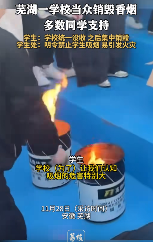 (信息来源:湖北日报2024年11月28日关于《芜湖一职业学院公开销毁香烟,学校回应:出于防火和学生健康考虑》的报道)