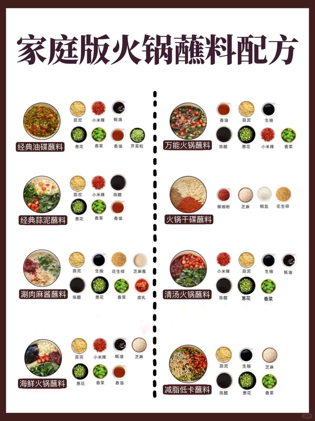 更有6种蘸料配方,万能蘸料、干碟蘸料、低卡蘸料……小白也能搭出灵魂蘸料👍