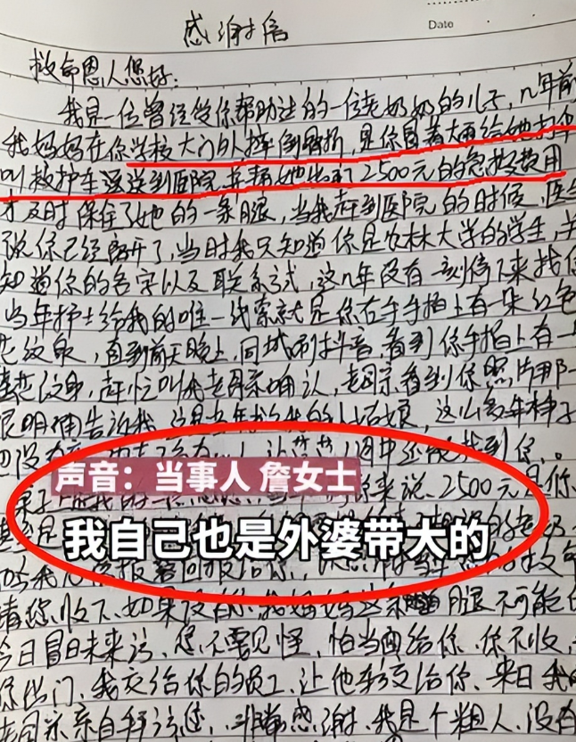 当老人的儿子找到詹女士时,什么也没说,只是将一个鼓囊的包裹塞到她手中。詹女士满心疑惑地打开包裹,震惊地发现里面整整齐齐地放着25000元现金和一封饱含深情的感谢信。信中诚挚地感谢詹女士当年的义举,并表明这是10倍偿还当年垫付的费用,以表达他们一家人深深的感激之情。