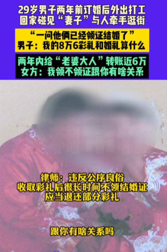 信息来源: 原文登载于河南广播电视台在2024年11月29日关于《11月28日播出节目河南周口 29岁男子两年前订婚后外出打工,回家碰见“妻子”与人牵手逛街, “一问他俩已经领证结婚了”男子:我的8万6彩礼和婚礼算什么 ?两年内给“老婆大人”转账近6万,女方:我领不领证跟你有啥关系》的报道。