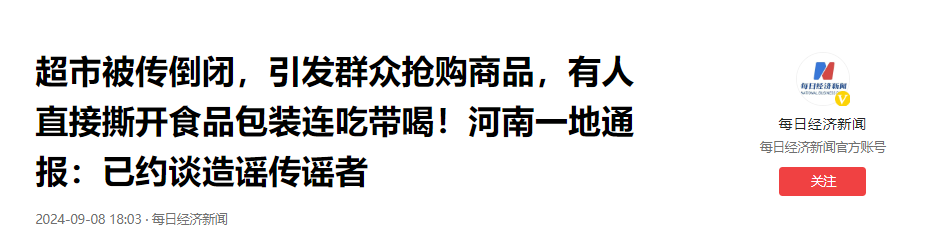 (信息来源:每日经济新闻 “超市被传倒闭,引发群众抢购商品,有人直接撕开食品包装连吃带喝!河南一地通报:已约谈造谣传谣者” 2024-09-08)