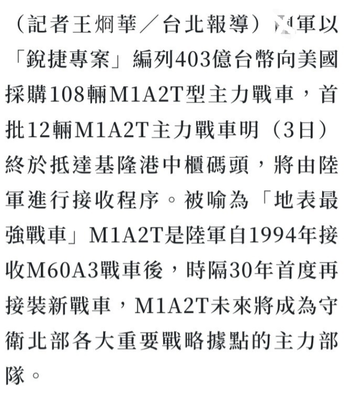 根据台媒的报道,台湾方面向美国采购的108辆M1A2T坦克,目前首批12辆已运抵台湾基隆港。