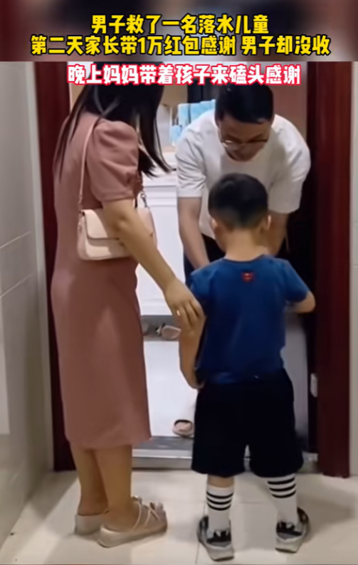 (来源:贵溪发布2023年6月5日关于《男子救了一名落水儿童,第二天家人带1万元红包登门感谢,男子却没收,晚上妈妈带孩子磕头道谢》的报道)