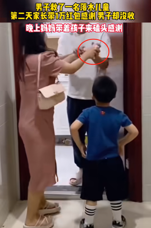 四川,2023年6月,男子路过河边,随手救下一名落水的男孩,孩子母亲连夜带着孩子登门感谢,还拿出10000元现金红包,男子没有犹豫当场收下,但他接下来的举动,让男孩跪下致谢!