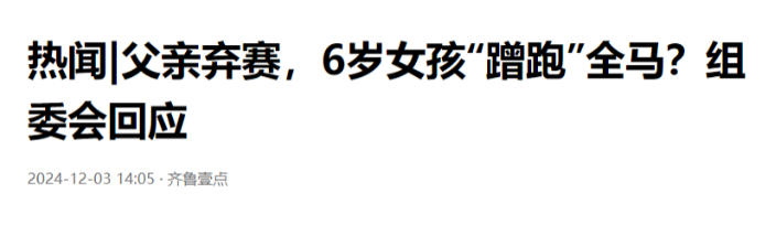 (信息来源:齐鲁壹点 2024年12月3日 《热闻|父亲弃赛,6岁女孩“蹭跑”全马?组委会回应》)