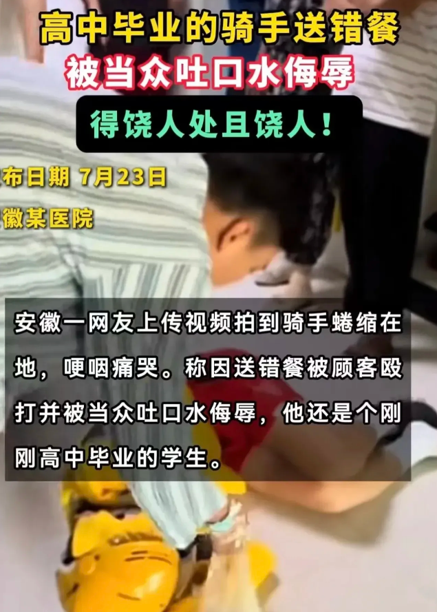 “我劝你善良!”安徽,小伙高中毕业做了外卖小哥,在给一住院的百万网红送外卖时,因送错了,被男子踹倒在地,还往他脸上吐口水,小哥蜷缩在地,痛哭失声并报了警,结局出乎意料。网友:遇到狠人,立马见红!欺负一个孩子算什么本事!