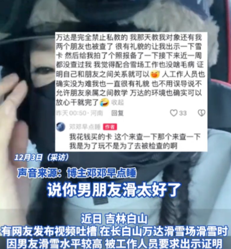 12月3日,一对情侣在滑雪时,因男友滑雪技术太好,竟被滑雪场工作人员质疑为无证教学,双方因此产生争执,甚至惊动了警方。