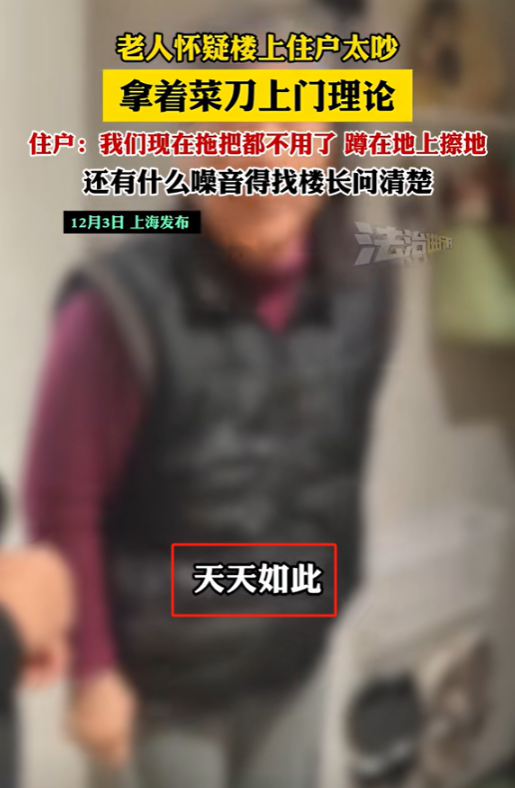上海,80岁老太太怀疑楼上晚上发出“哐!哐!哐!”的噪音,拿着菜刀上门讨说法,楼上男子委屈“我老婆蹲地上擦地,拖把都不敢用了!”老太太却还是不放过他们,夫妻俩快哭了!