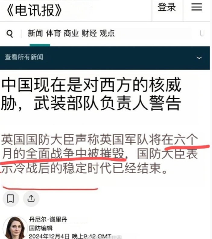 《电讯报》12月4日撰文,引述英国国防大臣约翰·希利的话称,中方现在是西方的大威胁。约翰·希利表示,一旦英军对中方开战,将在六个月内的全面战争中被摧毁。