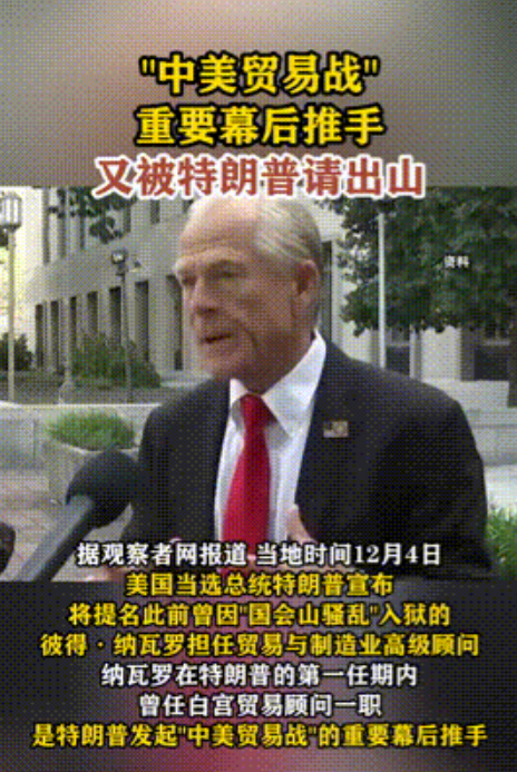 “中美贸易战”幕后推手重出江湖!被特朗普任命为高级顾问,又是反华鹰派! 彼得·纳瓦罗曾在特朗普第一任任期的时候就当了白宫的贸易顾问,是“中美贸易战”的重要推手。 特朗普认为纳瓦罗非常有效率,能够很好的执行他制定的规则。 于是这一次又将纳瓦罗提名为了贸易与制造业高级顾问,来帮助特朗普成功推动和传达他的制造业、关税和贸易议程。 对此有网友评论:“特朗普先把拜登给他挖的坑填满再说吧,贸易战以前又不是没打过,兵来将挡,水来土掩。” 一旦特朗普上任,中国要小心可能会出现的第二次”贸易战“。