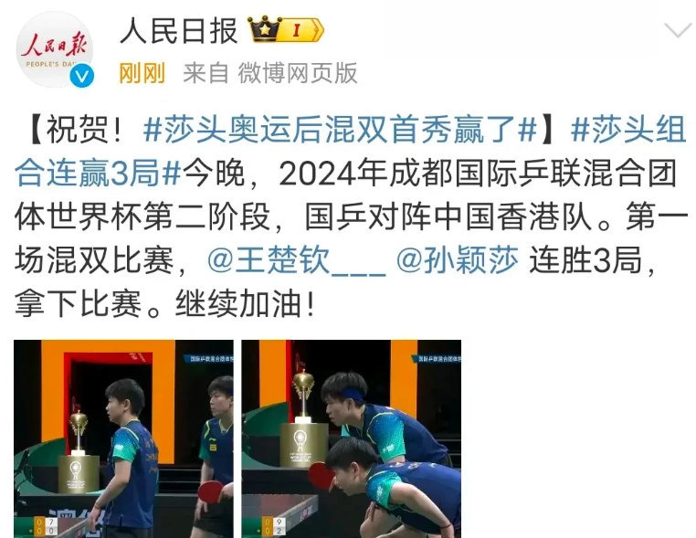 秒发,央妈的爱从来都是明明白白,坦坦荡荡!王楚钦孙颖莎3-0光速下班,为队伍拿下3分。