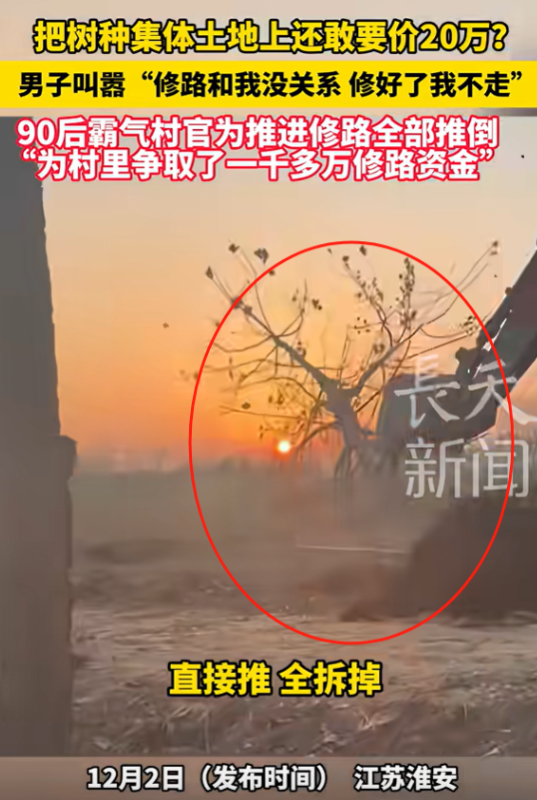 狮子大开口!江苏一90后村官争取到1000万资金给村里修路,却被集体土地上的大树拦住了,树主人不愿推倒大树,还开口要20万,村官霸气回怼“直接全推倒”,当场将大树连根拔起!