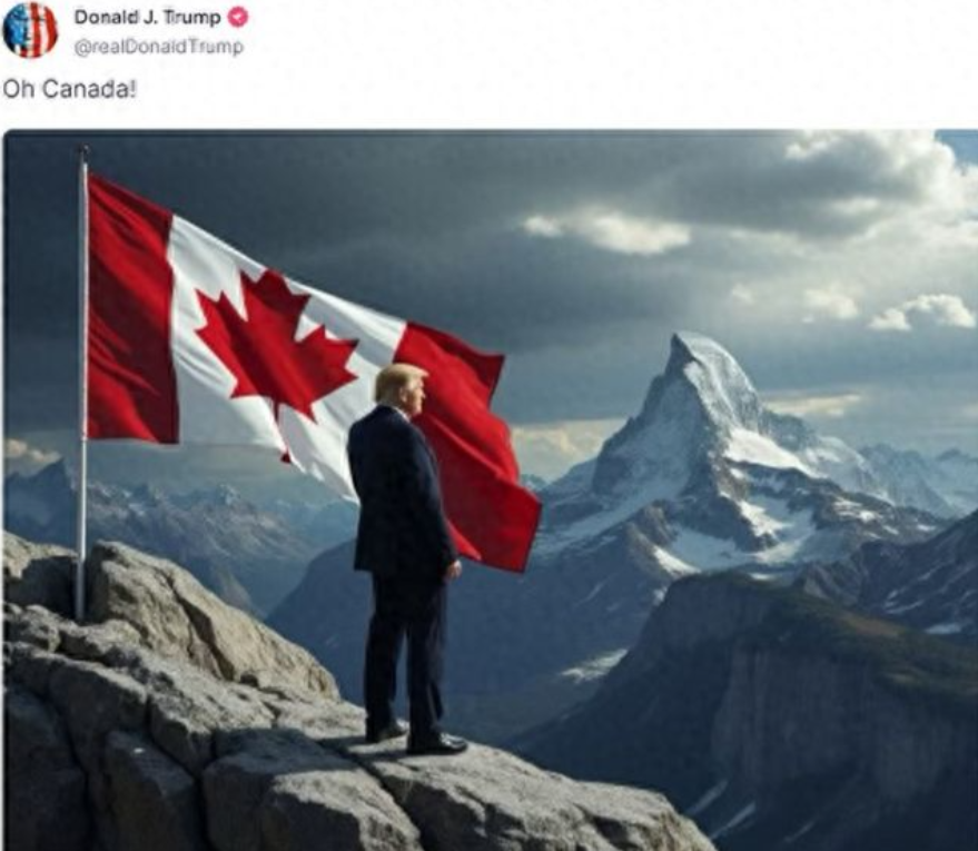 特朗普上台之后,或将吞并加拿大! 誓言“让美国再次强大”的特朗普,上台后或将吞并加拿大。 日前,特朗普发布一张AI生成的照片。照片中,他站在山巅的一块巨石上俯瞰群山,旁边有一面加拿大国旗。他还配文“哦,加拿大!”